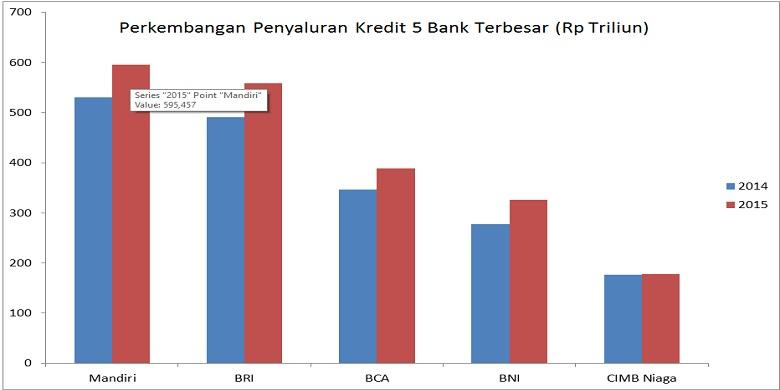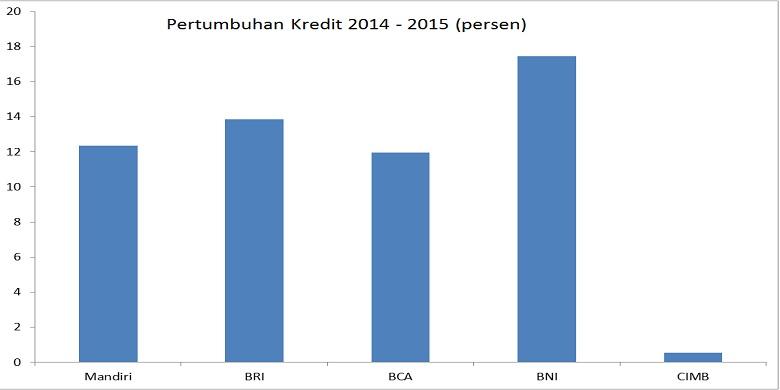 Dilihat dari penyaluran kredit tahun 2015, empat bank yakni Mandiri, BRI, BCA, dan BNI bisa mencatat pertumbuhan di atas 10 persen dibandingkan tahun 2014.